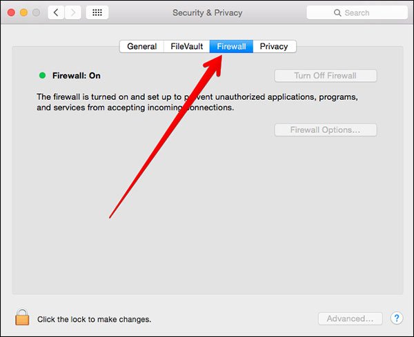 - Wähle aus Firewall Klicken Sie auf die Registerkarte und klicken Sie auf das Schlosssymbol, um die Einstellungen zu bearbeiten