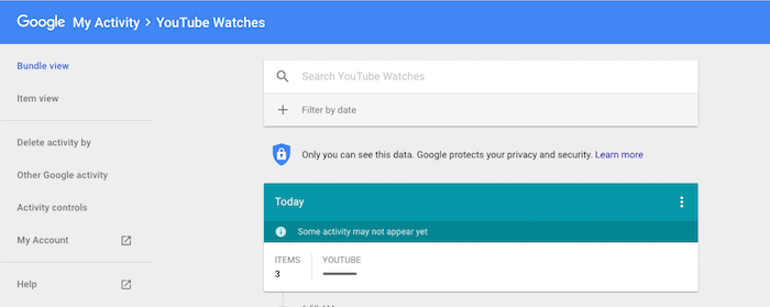 Dies ist jedoch nicht der einzige Schritt, den Sie ausführen müssen. Sie müssen MyActivity.Google.Com weiterhin besuchen und sicherstellen, dass Sie bei demselben Konto angemeldet sind. Filtern Sie dann zu YouTube unterhalb der Suchleiste. Sie können sie einzeln löschen, wenn Sie möchten.
