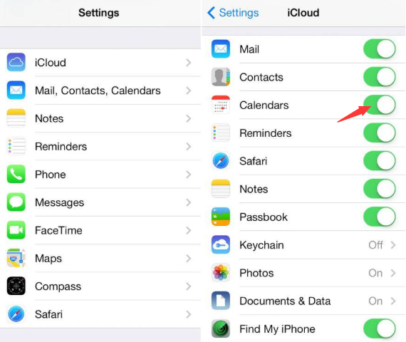 Klicken Sie (sodass dort ein Haken erscheint) auf das Rechteck neben Einstellungen> getroffen "DEIN NAME"> iCloud für Kalender ausschalten. Schalten Sie den Schalter in wenigen Sekunden wieder ein. Es funktioniert wie ein Zauber, wenn das Problem nicht mit Ihrem Mac oder iPhone zusammenhängt. Dieser Ansatz aktualisiert die iCloud-Plattform und stellt die Standardeinstellungen wieder her.