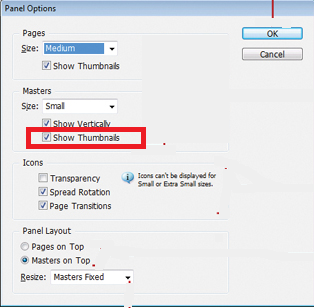 Seitenminiaturen können eine Verzögerung verursachen. Sie können auf sie verzichten, um zu verhindern, dass InDesign zu hart arbeitet. Daher können Sie es deaktivieren, indem Sie das Kontrollkästchen neben Miniaturansichten anzeigen im Fenster Bedienfeldoptionen deaktivieren.