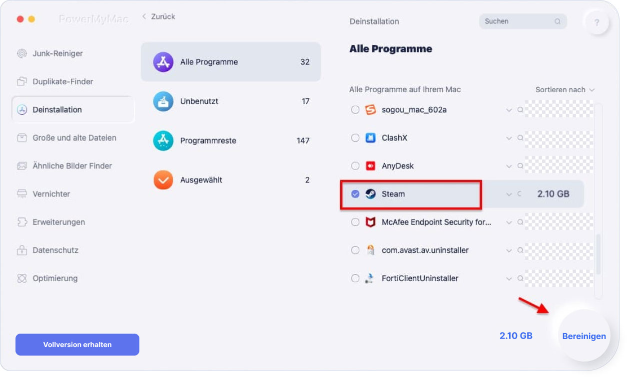 Es wird empfohlen, ein professionelles Deinstallationsprogramm von PowerMyMac zu installieren, um den Deinstallationsvorgang ohne Kopfschmerzen durchzuführen. Mit nur wenigen einfachen Schritten können Sie Steam deinstallieren Mac. Übrigens: PowerMyMac ist ein leistungsfähiges Deinstallationsprogramm, mit dem Sie alle unerwünschten Dateien vollständig entfernen können!