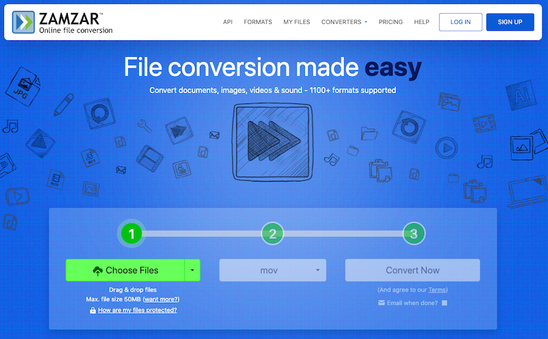 Mit Zamzar können Sie WMV-Dateien in jedes gängige Audio- und Videoformat konvertieren. Darüber hinaus bietet es Konvertierungen für Musik, Bilder und Dokumente. Beachten Sie, dass Sie sich für das entsprechende Abonnement anmelden müssen, wenn die Videodatei 50 MB überschreitet. Verwenden Sie Zamzar, um WMV in MOV unter Windows und Mac zu konvertieren, indem Sie diese einfachen Anweisungen befolgen.