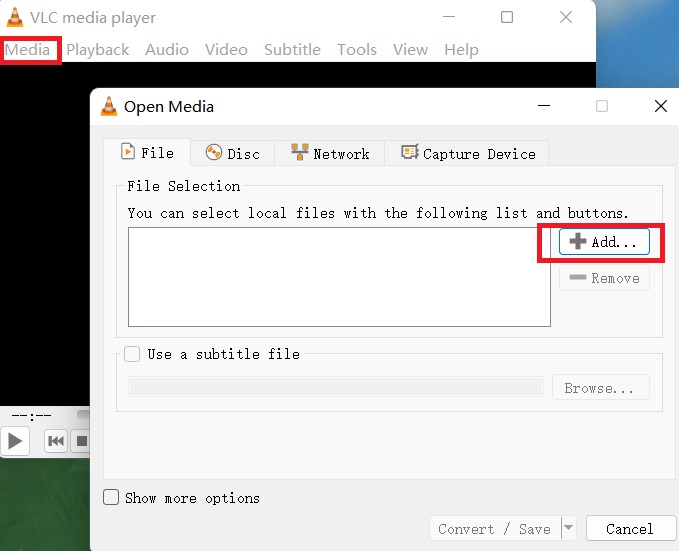 - Gehen Sie in der VLC-Home-Oberfläche zu Medien Menü und wählen Sie aus Konvertieren / Speichern , um auf das Fenster „Medien öffnen“ zuzugreifen.