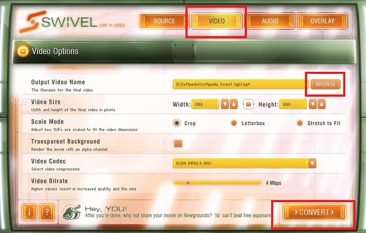 Dies ist ein kostenloses Programm. Es ist jedoch nur für SWF-Dateien beschränkt. Es bietet einige Codecs für die Ausgabe, aber nicht so viele wie die vorherige Option. Trotzdem ist es ein Programm, das es wert ist, untersucht zu werden. Wie jedes kostenlose Programm wird Swivel auf einer Reihe von Websites angeboten.